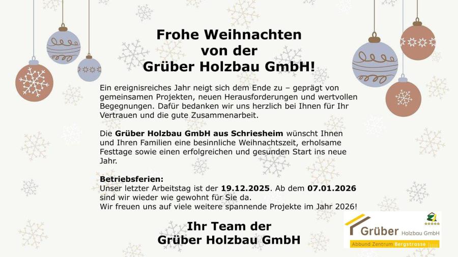 Das Team der Grüber Holzbau GmbH wünscht Ihnen und Ihrer Familie frohe Festtage und